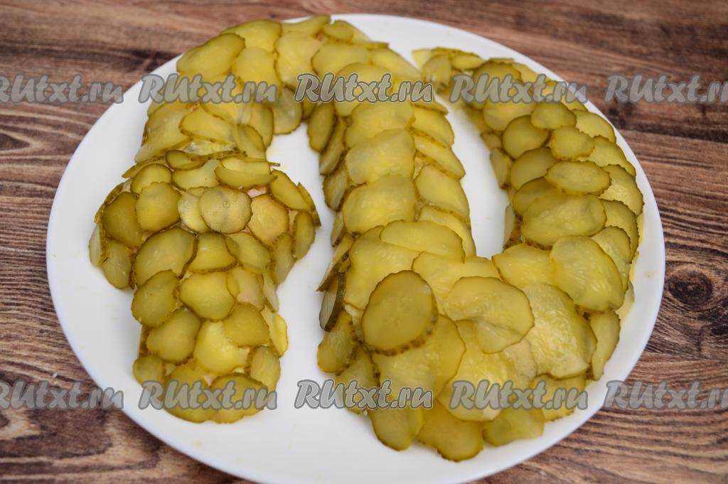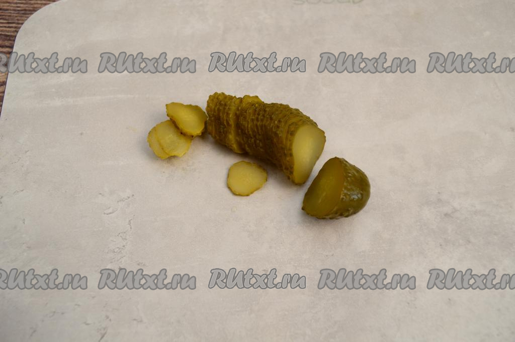 Теперь настало время украсить наш праздничный салат. Небольшие маринованные огурчики нарезать на очень тонкие кружочки.