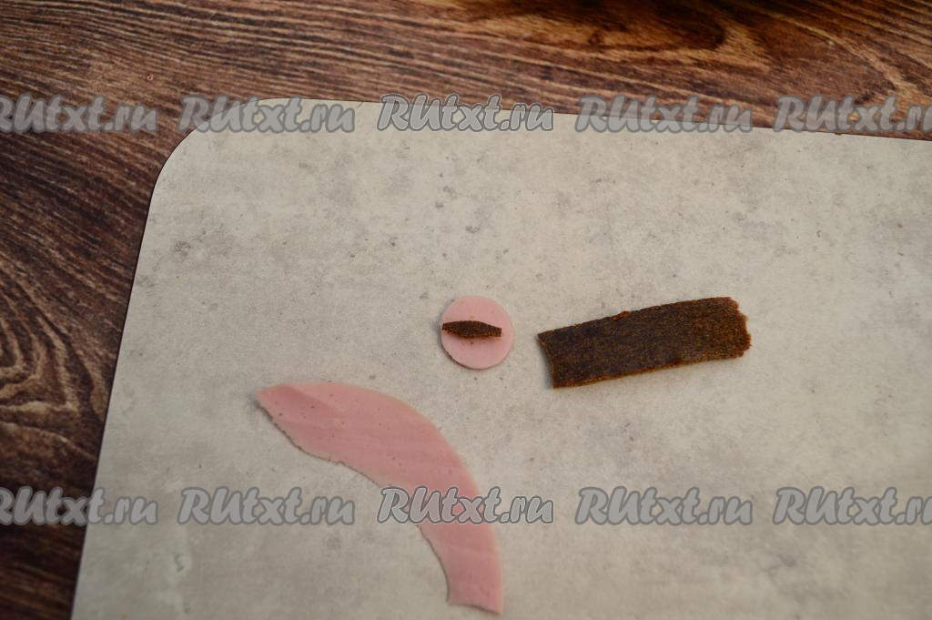 Из кусочка колбасы вырезать два круглых глаза, а из корочки чёрного хлеба - два узких зрачка пресмыкающегося.