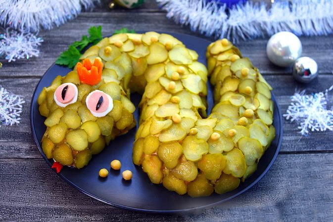 Салата получается достаточно много, на выкладывание всей змеи у меня ушла примерно половина приготовленного оливье. Я оставшийся салат подала в большом салатнике. Если ваша цель сделать только тематическую подачу, тогда можете взять в два раза меньше ингредиентов.