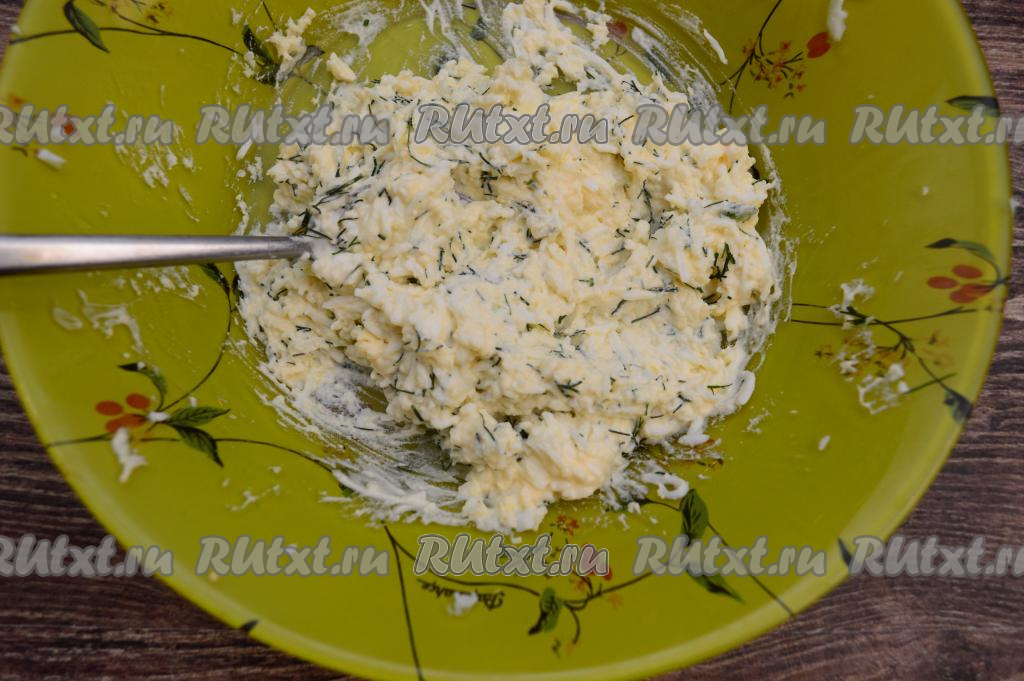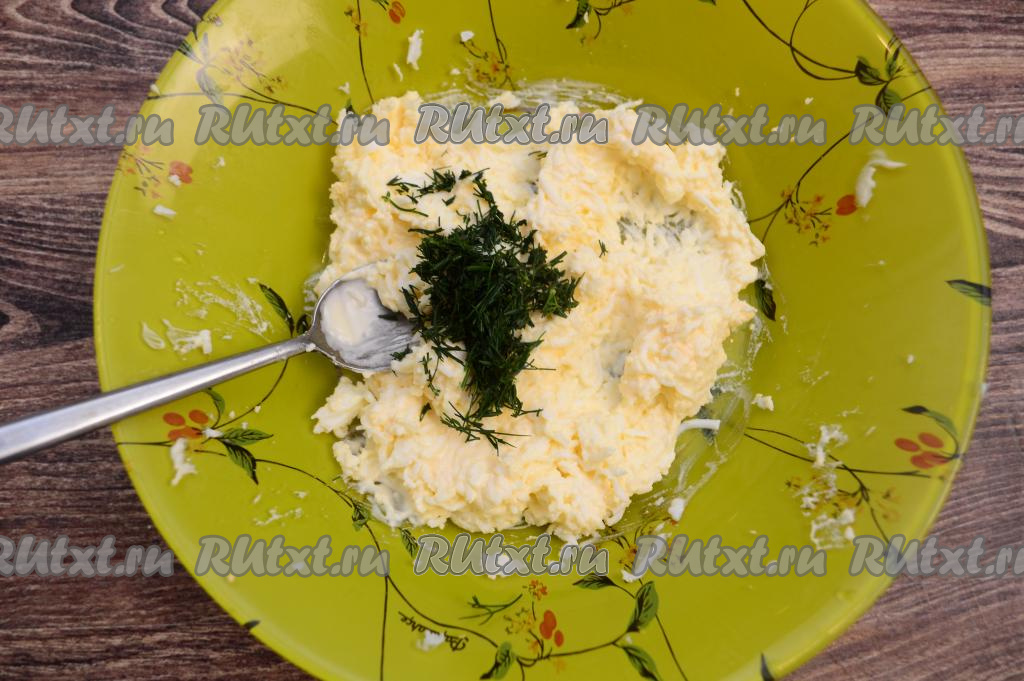 Зелень укропа промыть, обсушить, мелко нарезать и добавить в яичную массу.