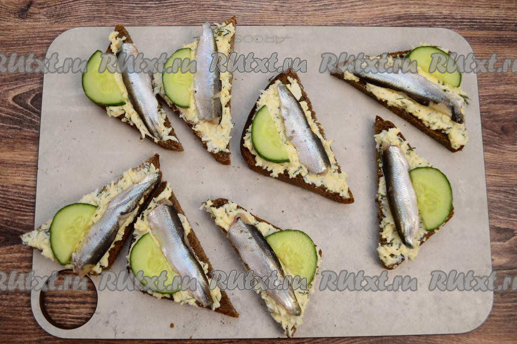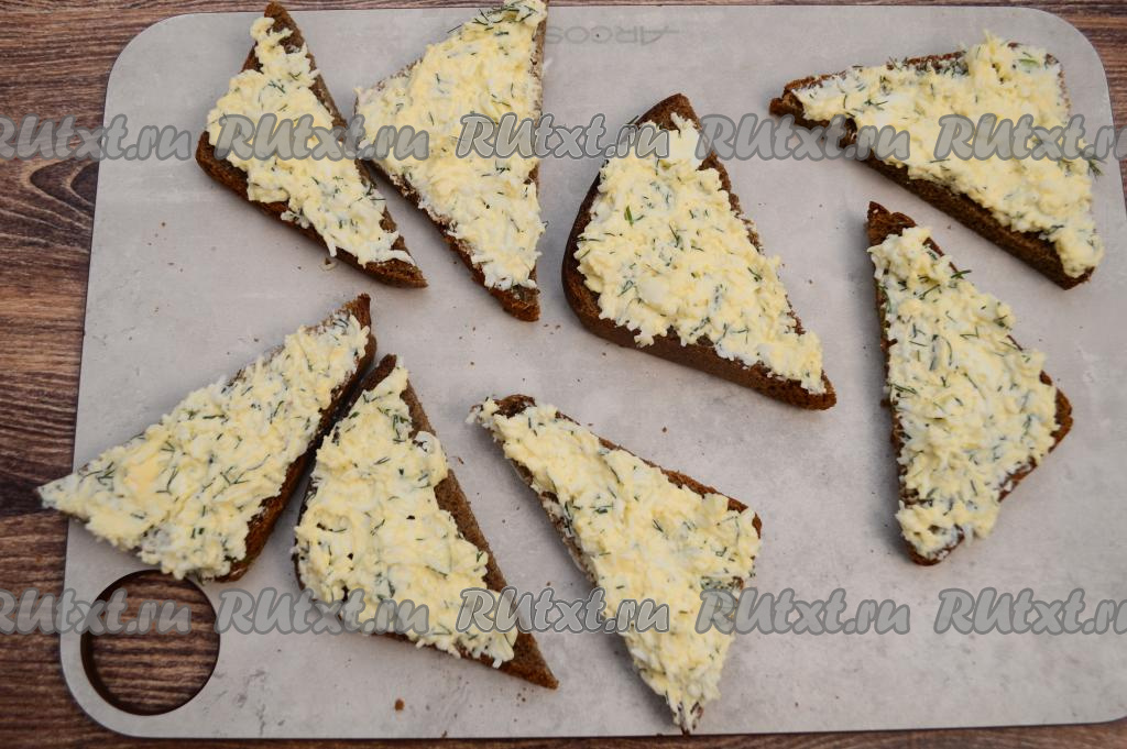 Чёрный хлеб подсушить на сухой сковороде или в тостере. Нарезать каждый ломтик хлеба по диагонали, чтобы получились треугольные бутерброды.