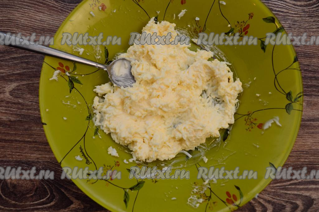 Остудить варёные яйца, очистить и натереть на мелкой тёрке в глубокую тарелку.