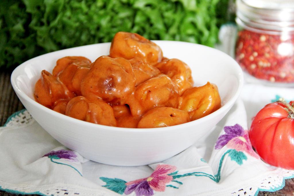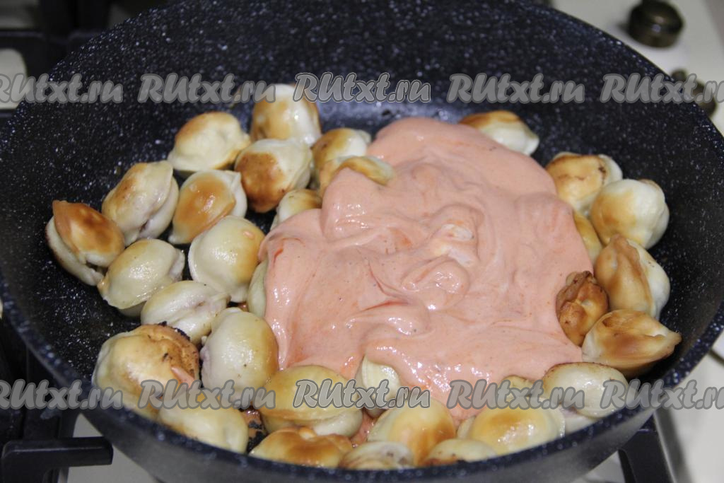 Добавить соус в сковороду и перемешать с пельменями.