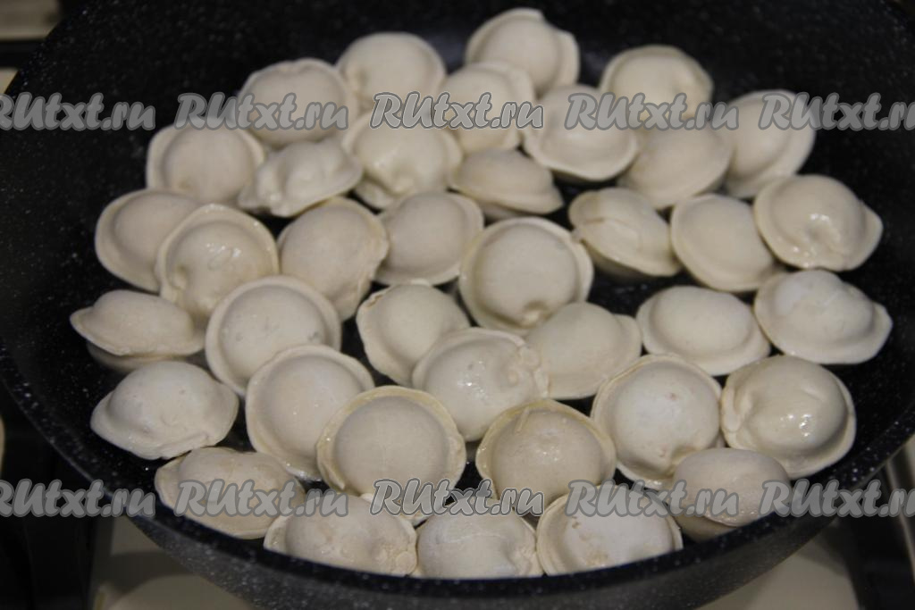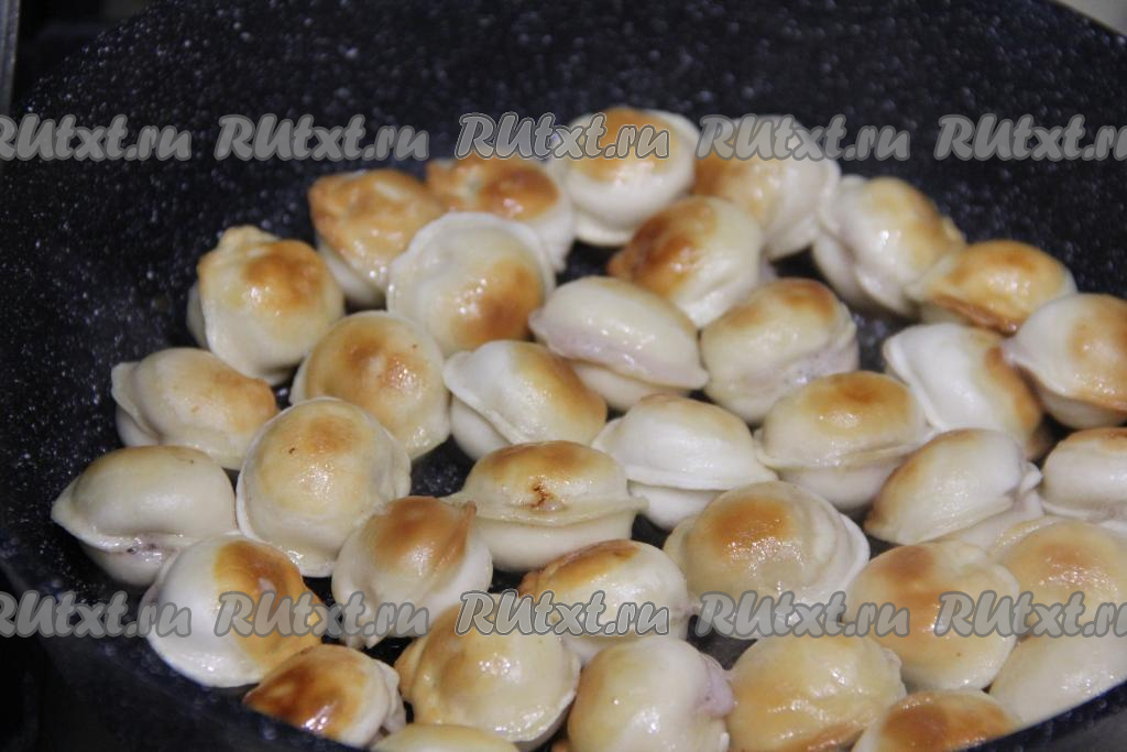 Обжарить пельмени на среднем огне с двух сторон до золотистого цвета (примерно в течение 4-5 минут с каждой стороны).