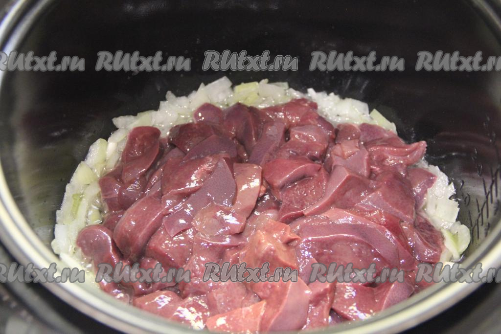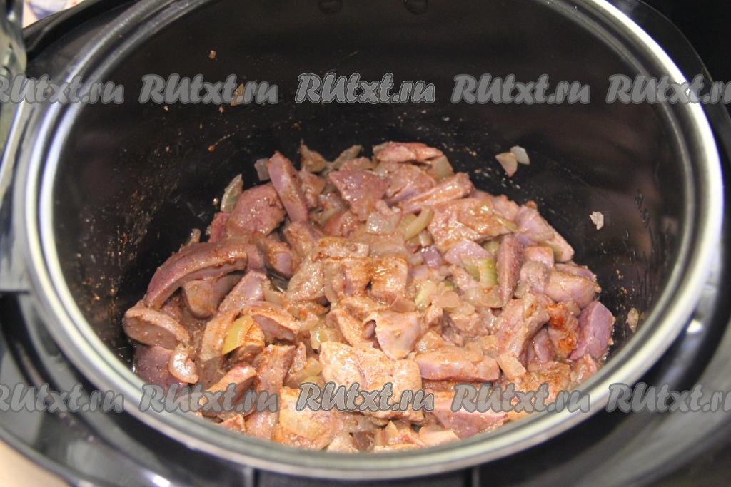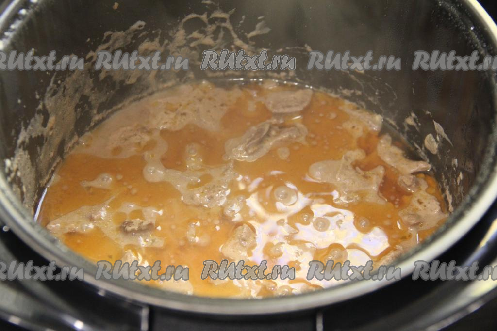 Перемешать печень с соусом, выставить режим "Тушение" на 30 минут, закрыть крышку мультиварки.