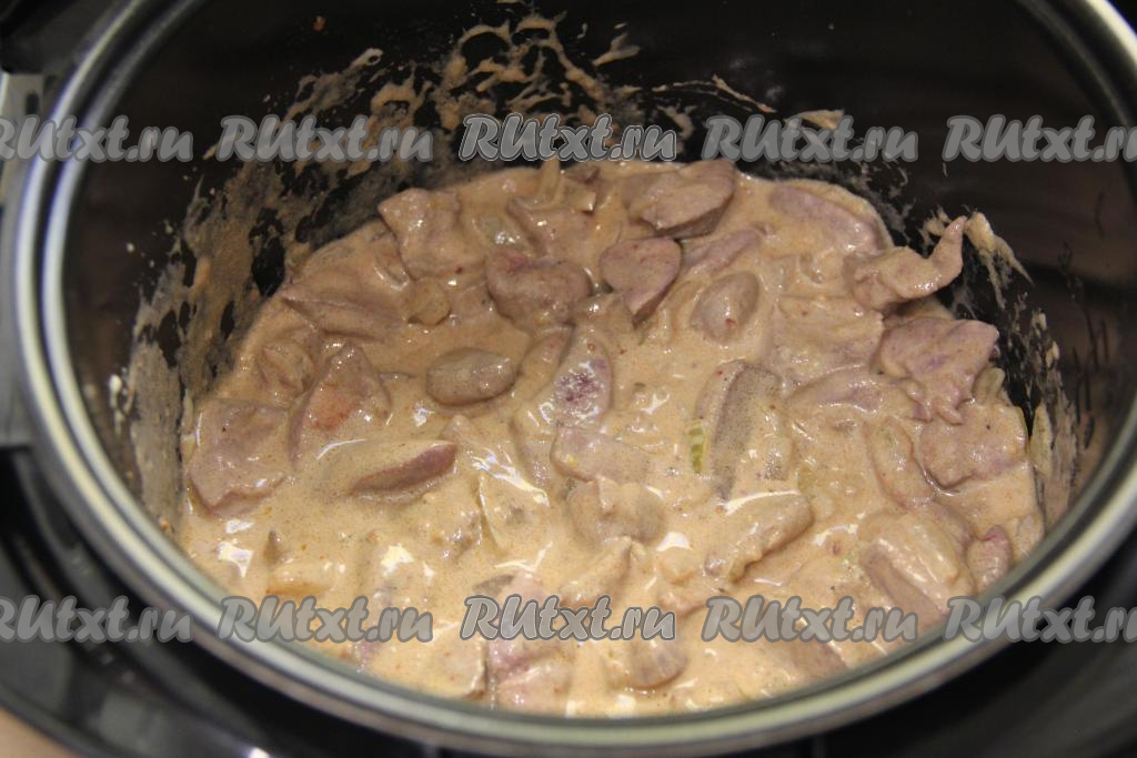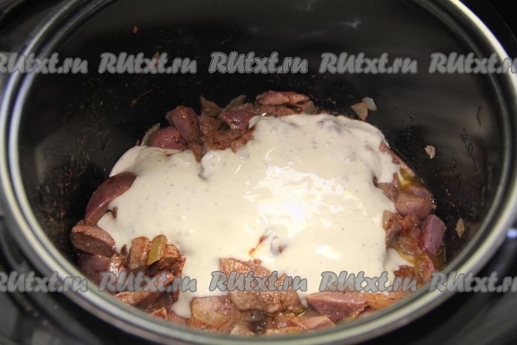 В чашу мультиварки со свиной печенью, обжаренной с луком, выложить соус из сметаны.