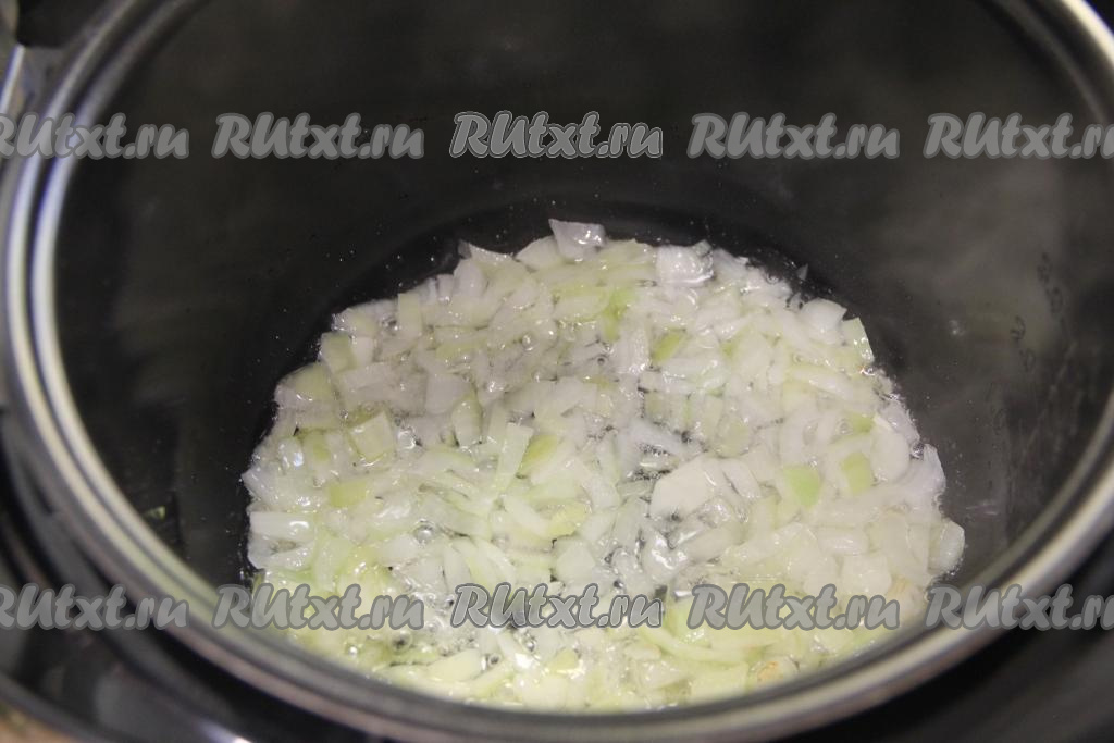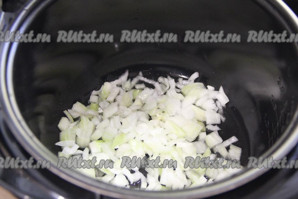 В чашу мультиварки влить растительное масло, выставить режим "Жарка". Лук почистить, мелко нарезать, выложить в чашу.