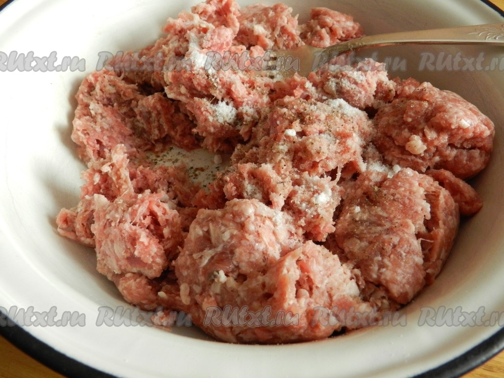Фарш посолить, поперчить по вкусу, тщательно вымесить, чтобы он стал однородным и мягким.