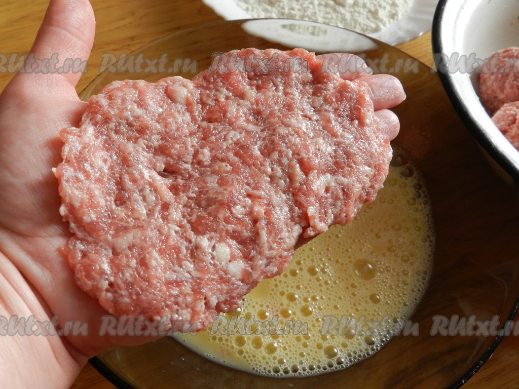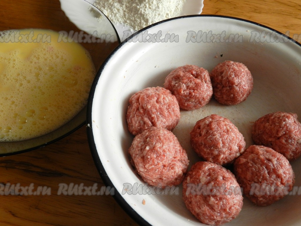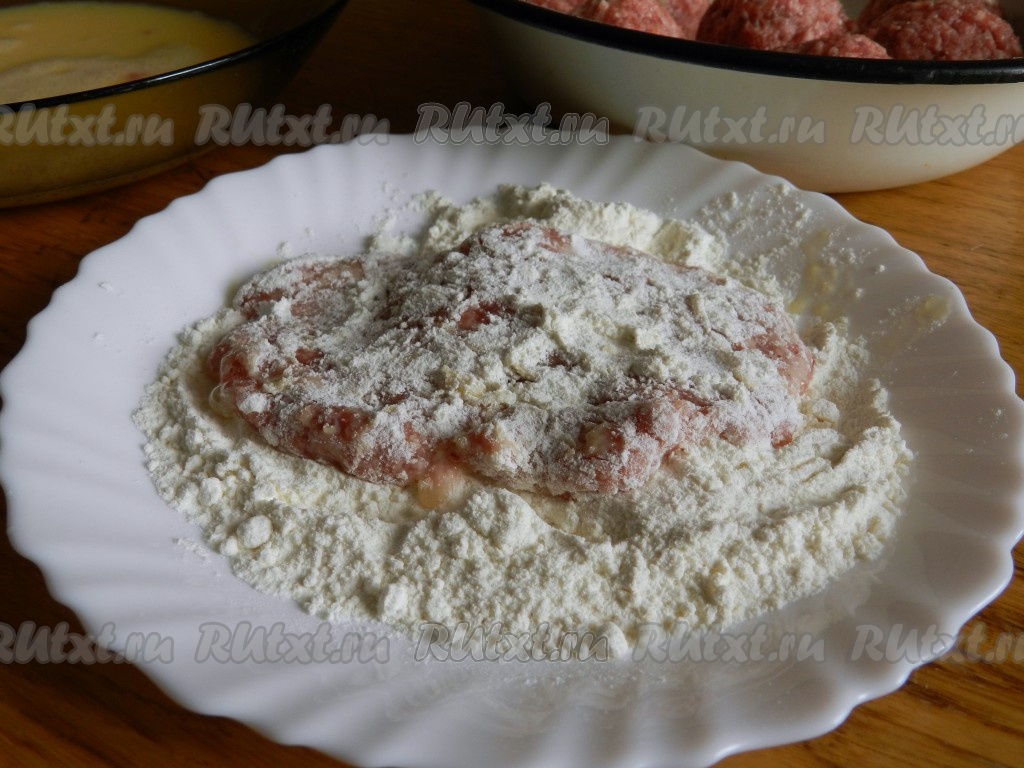 Фарш разделить на равные части. Яйца слегка взбить, муку высыпать на плоскую тарелку.