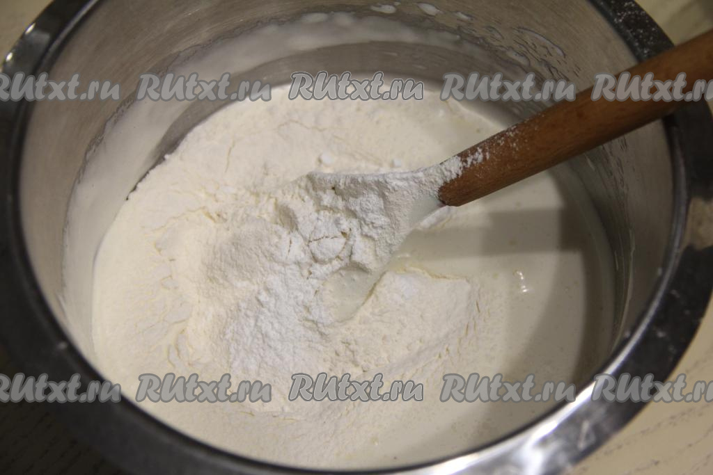 Всыпая понемногу муку и вмешивая её, учитывайте, что тесто должно получиться очень воздушным.