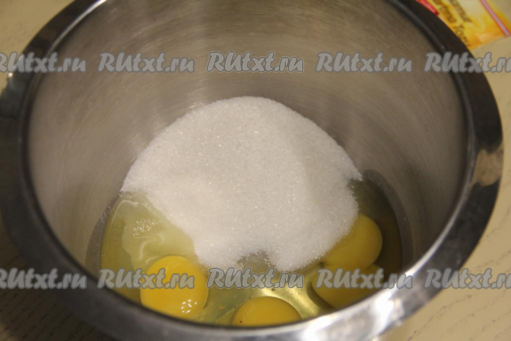 В чашу миксера выложить сырые яйца, соль и сахар.