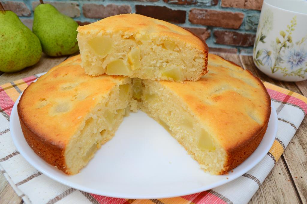 А вот как манник с грушами, приготовленный на кефире, выглядит в разрезе. В этой выпечке нежное тесто удачно сочетается с сочными кусочками фруктов. Угощайтесь!