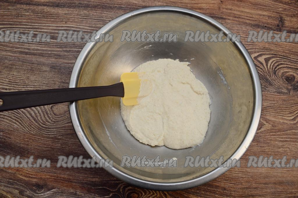 Небольшими порциями добавляя муку и тщательно вмешивая её лопаткой, замесить тесто, напоминающее в меру густую сметану, с лопатки оно должно стекать широкой лентой.