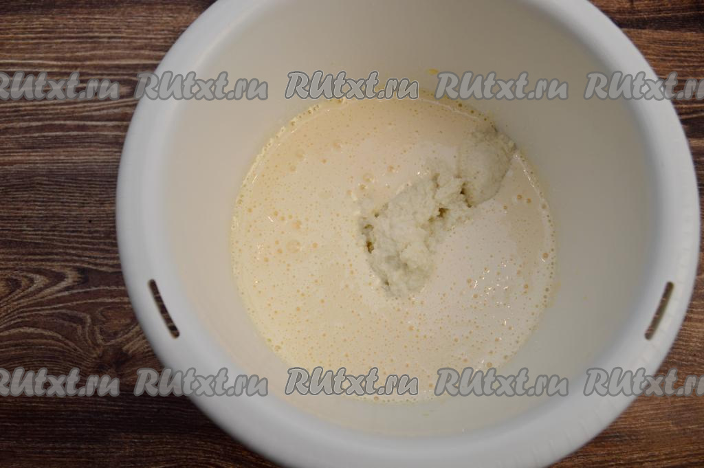Взбить яйца с сахаром миксером на максимальных оборотах в течение 5 минут. Масса побелеет и увеличится в объёме. Добавить в чашу разбухшую манку.