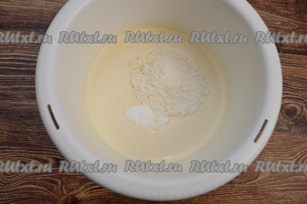 Всыпать разрыхлитель и часть муки, перемешать лопаткой.