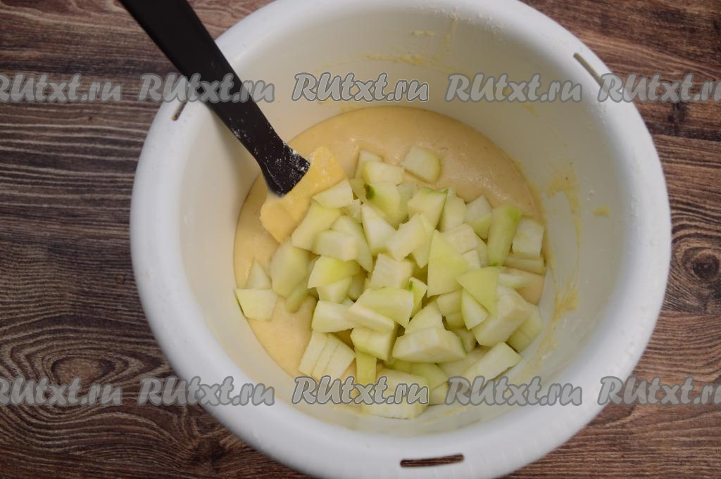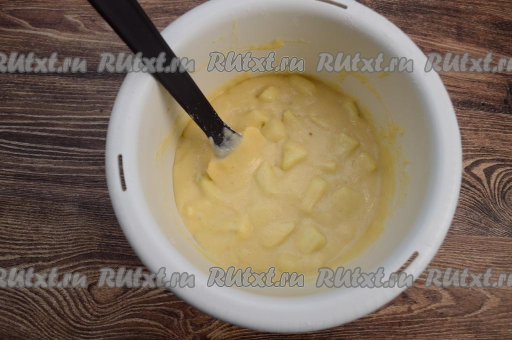 Перемешать тесто лопаткой, аккуратно вмешивая в него груши, распределяя равномерно фрукты по всему тесту.