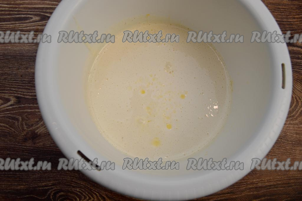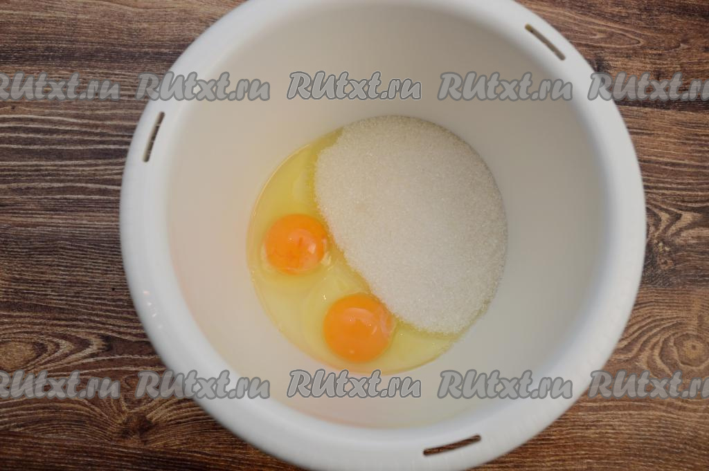 Сливочное масло растопить до жидкого состояния (я растопила в микроволновке), дать немного остыть. В чашу для взбивания выложить сахар, вбить сырые яйца.