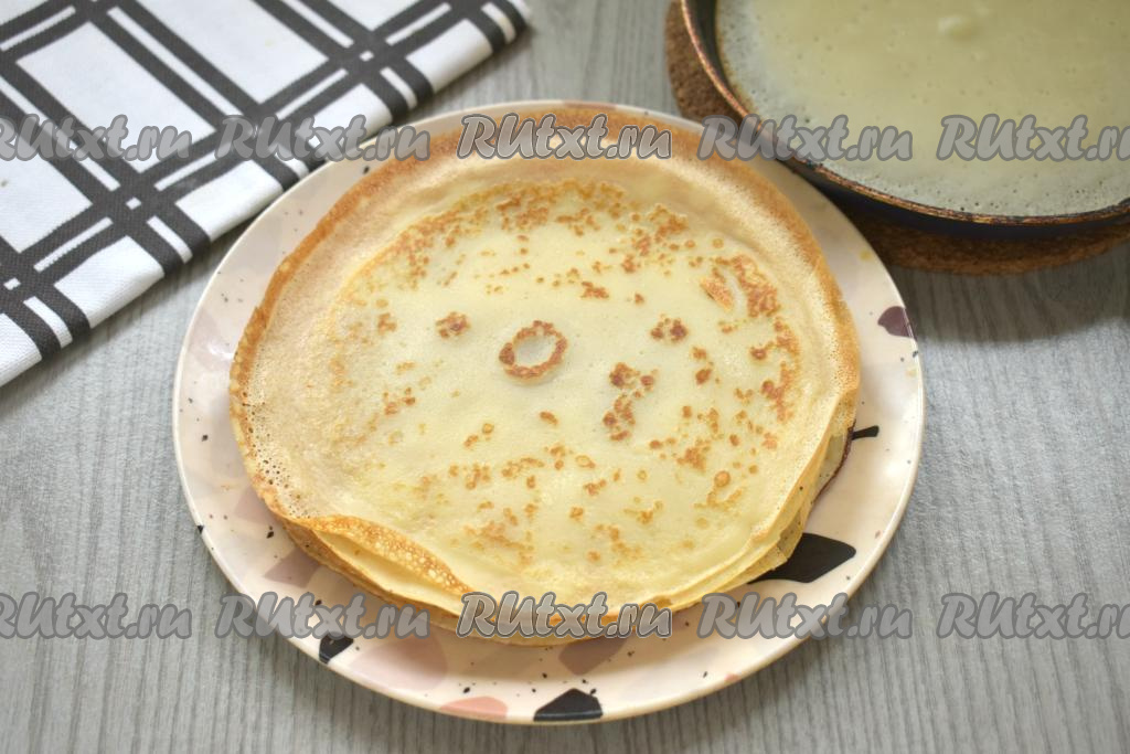 Затем перемешиваем тесто. Смазываем дно сковороды растительным маслом и хорошо прогреваем на достаточно сильном огне, уменьшаем огонь до среднего. При помощи половника выливаем на сковороду небольшую порцию блинного теста, распределяя по всей поверхности. Жарим блинчик до золотистости с двух сторон (примерно по 1 минуте с каждой стороны), перекладываем на тарелку. Периодически перемешивая блинное тесто, чтобы оно не оседало на дне миски, постепенно жарим все блинчики. В процессе жарки сковороду обычно смазывать больше маслом не требуется, но многое зависит от качества покрытия сковороды.
