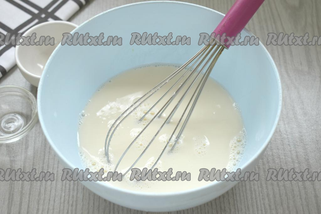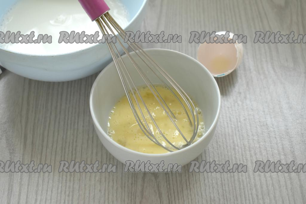 Взбитое яйцо переливаем в молочную смесь, всыпаем сахар и соль, хорошо перемешиваем венчиком.