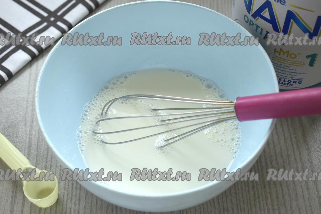 В глубокую миску вливаем тёплую воду, всыпаем детскую молочную смесь и хорошо размешиваем венчиком, чтобы не было комочков.