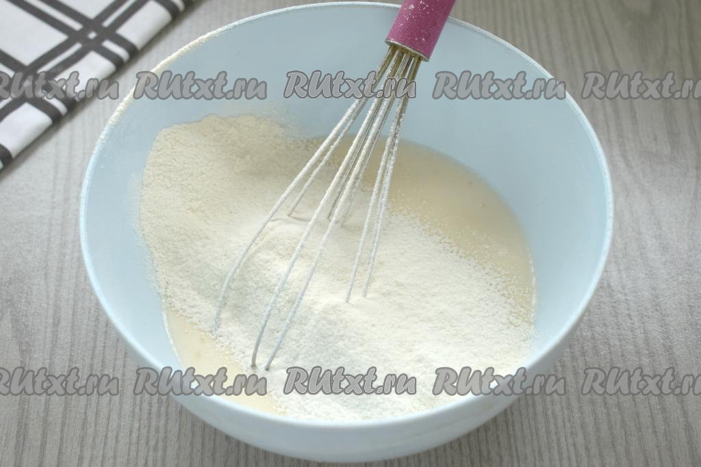 В молочно-яичную смесь просеиваем грамм 50 муки и сразу перемешиваем. Понемногу подсыпая оставшуюся муку и вмешивая её, замешиваем тесто. В итоге тесто для блинов должно быть и не густым, и не слишком жидким. Количество муки может быть чуть больше или меньше, чем указано в ингредиентах.