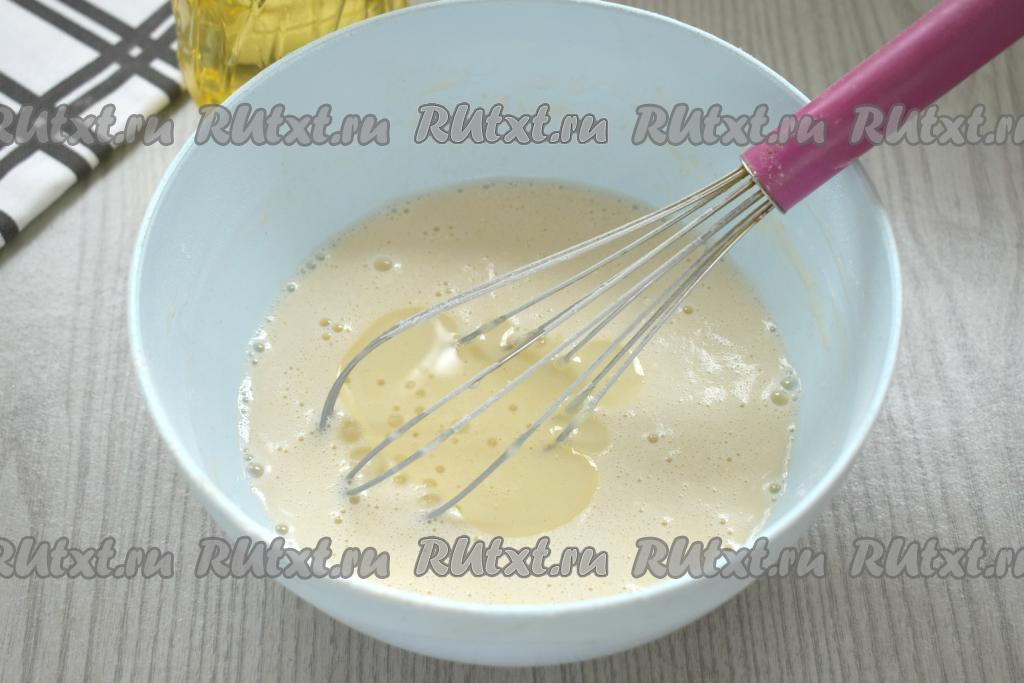 В получившееся блинное тесто, замешанное на сухой детской молочной смеси, вливаем 1 столовую ложку растительного масла и перемешиваем. Тесту даём постоять в течение минут 10.