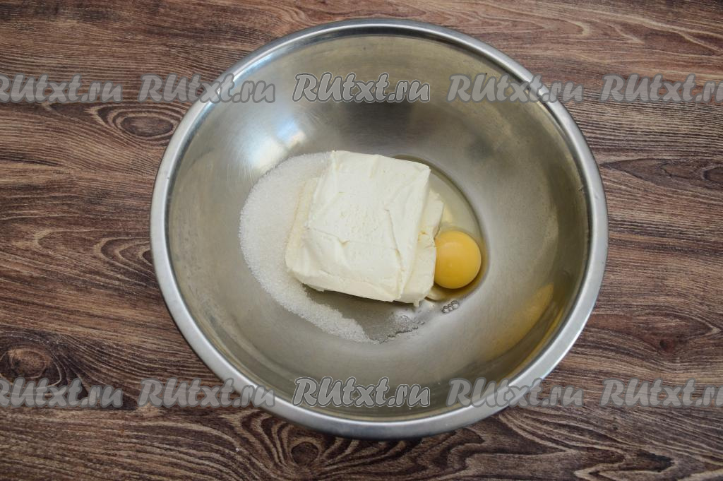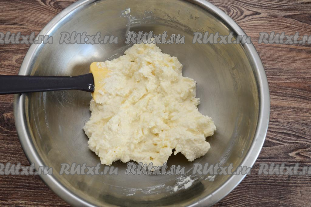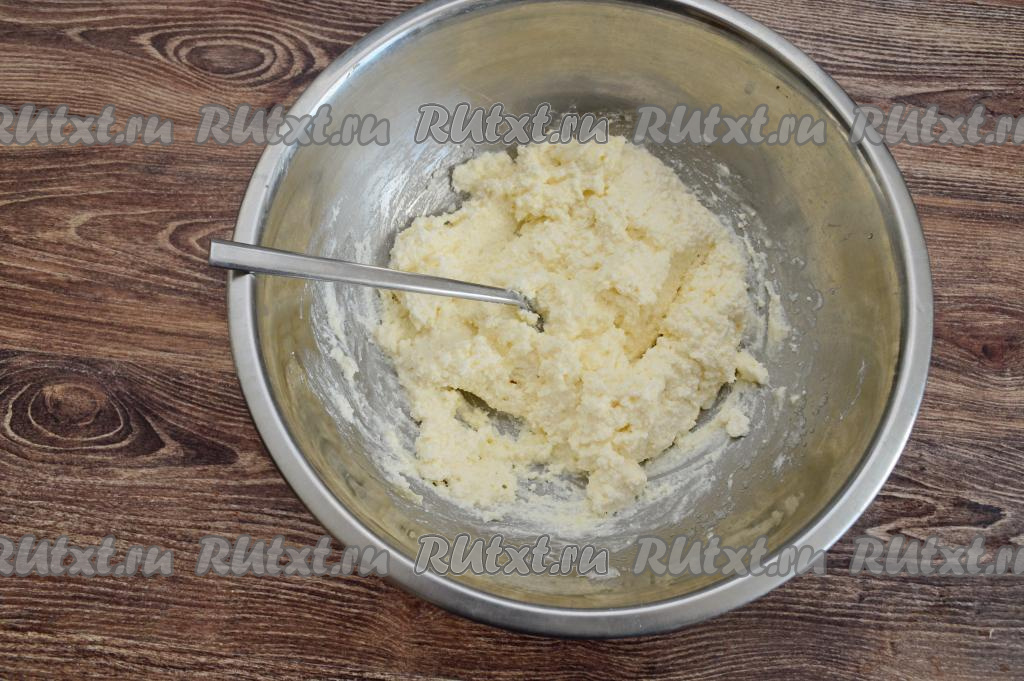 Смешать вилкой сахар, творог и яйцо до получения однородной творожной массы.