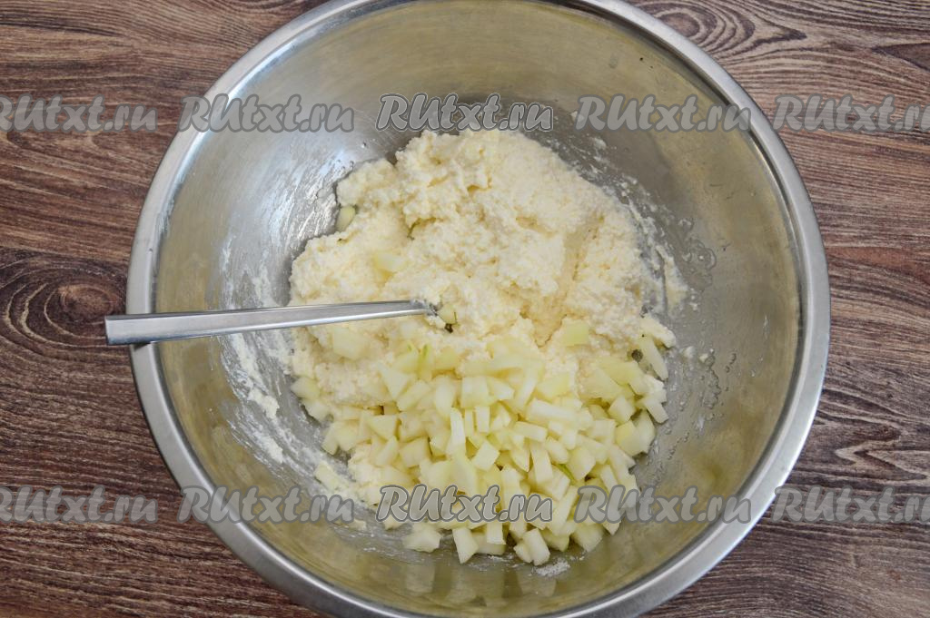 Добавить нарезанную (или натёртую) грушу в миску с творожной массой.