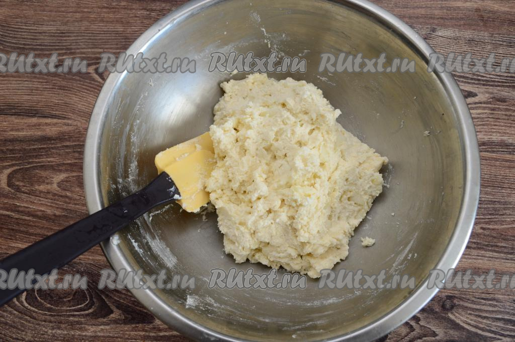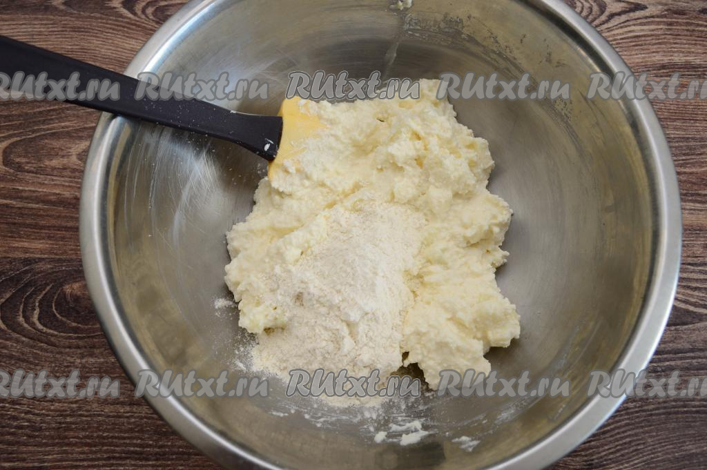 Всыпать в миску половину муки (примерно 40 грамм) и очень хорошо вмешать в творожное тесто лопаткой.