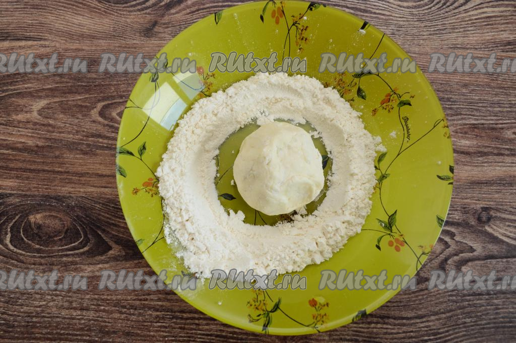 Разделить зрительно получившееся тесто из творога и груш на 8 равных частей. На тарелку насыпать 2 столовых ложки муки. Руки слегка смочить водой, взять одну часть теста, сформировать круглый сырник, выложить его на тарелку и со всех сторон обвалять в муке.