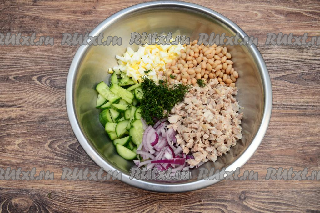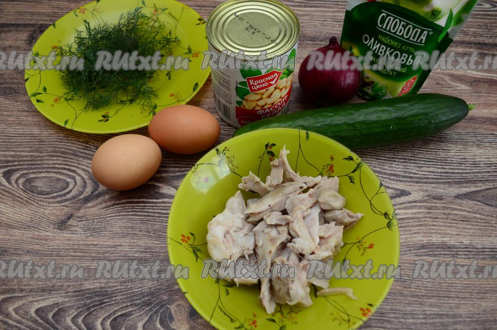 Яйца очистить и нарезать на небольшие кубики. Консервированную фасоль из банки откинуть на сито (можно промыть фасоль под проточной водой, чтобы убрать остатки жидкости, в которой она находилась в банке), оставить на несколько минут, чтобы стекла лишняя жидкость. В глубокую миску выложить яйца, мясо курицы, огурцы, лук, зелень и консервированную фасоль.