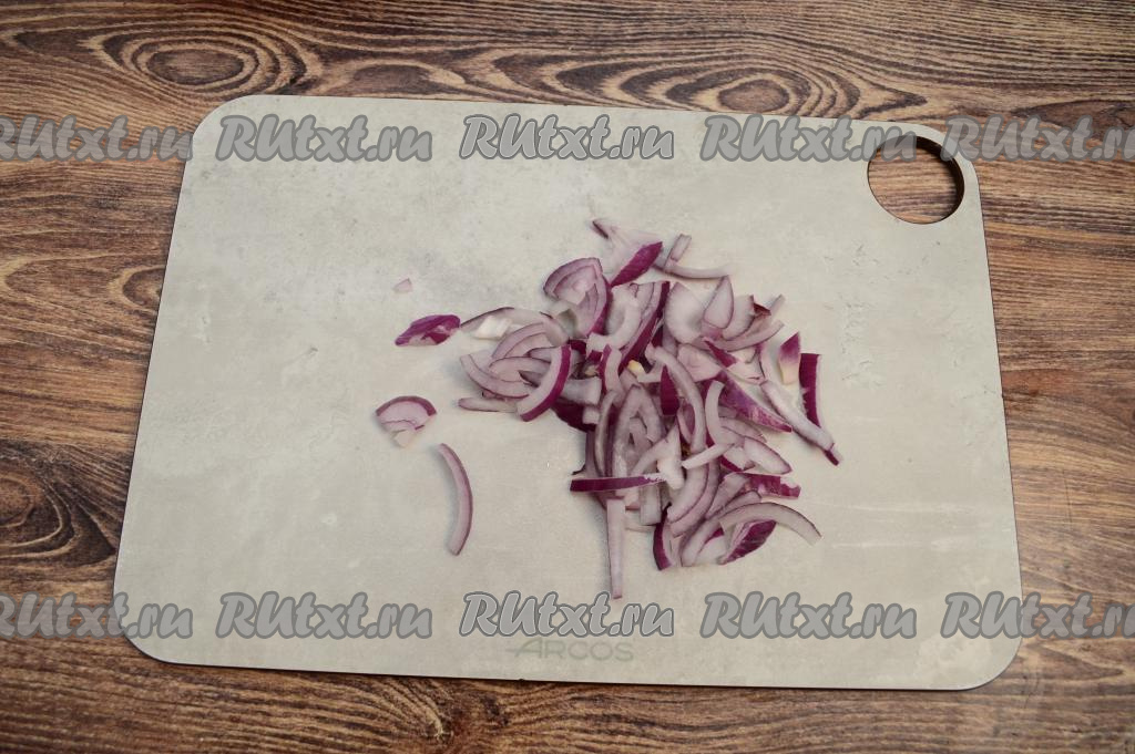 Я взяла красный лук, он более сладкий, не горчит, поэтому придаёт салату приятную, в меру сочную, пикантную нотку.