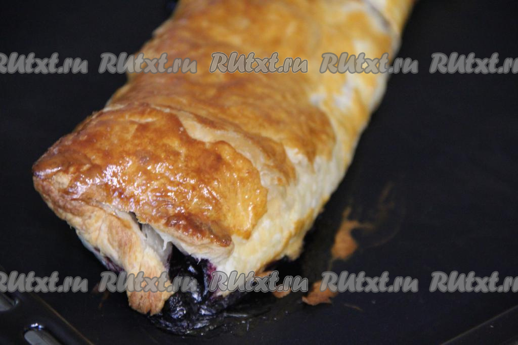 Выпекать рулет с черникой в разогретой до 200 градусов духовке минут 25-30 (до подрумянивания слоёного теста).