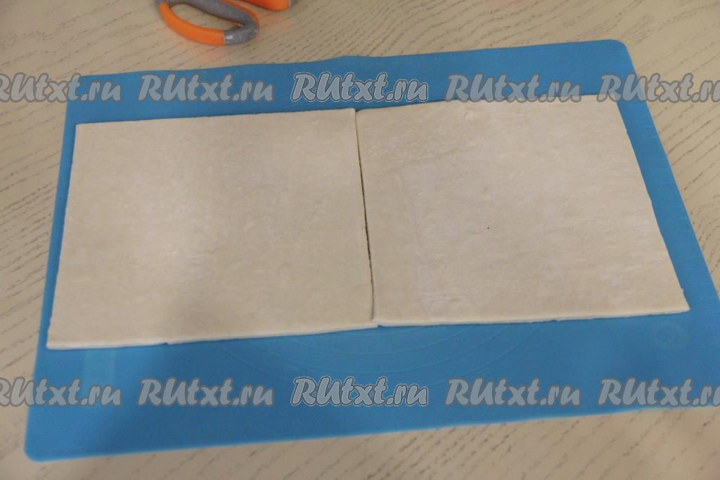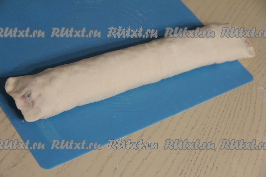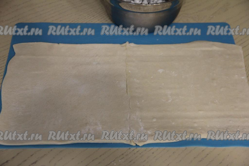 У меня тесто было в двух квадратных пластах. На слегка присыпанную мукой поверхность выложить два пласта теста впритык друг к другу, защипать шов, чтобы получился один большой прямоугольный пласт теста.
