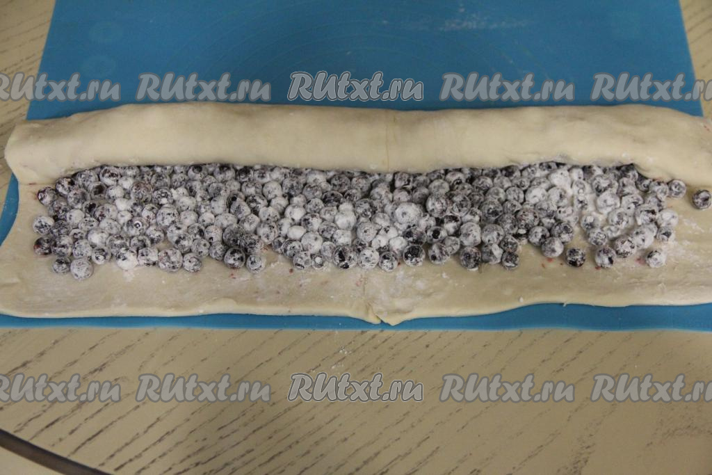 Аккуратно свернуть тесто с ягодами в рулет, начиная с длинного края.