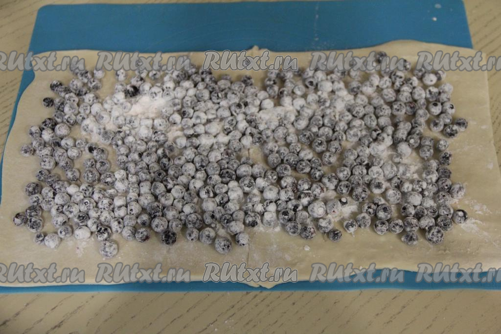 Выложить ягоды на пласт теста и равномерно распределить их по тесту, отступив примерно 3-4 сантиметра от краёв.