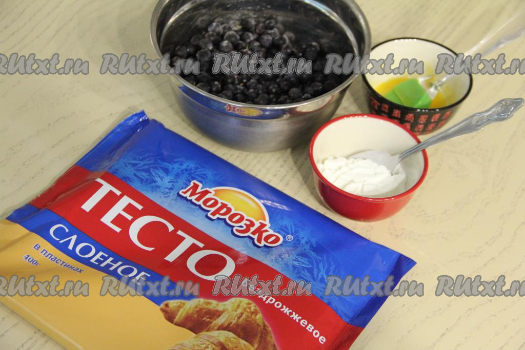 Подготовить продукты. Для приготовления этого рулета подойдёт как дрожжевое, так и бездрожжевое слоёное тесто. Разморозить тесто при комнатной температуре, оно должно стать достаточно мягким. Чернику можно взять как свежую, так и замороженную. Свежие ягоды нужно будет перебрать, промыть водой и немного обсушить, выложив на бумажное полотенце. Если же вы готовите с замороженной черникой, на которой нет большого количества льда, тогда ягодки можно не размораживать.
