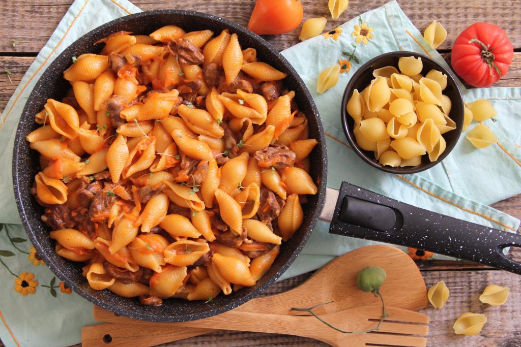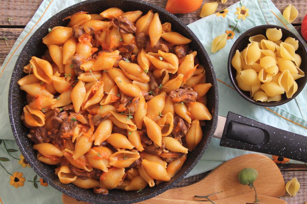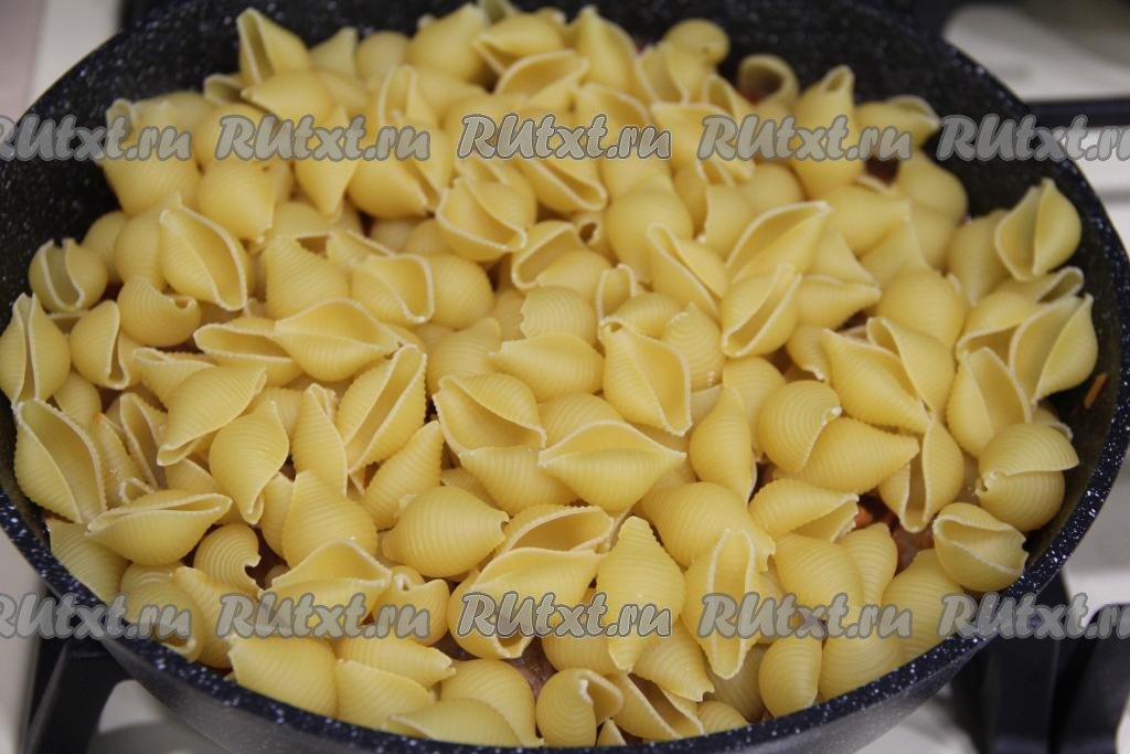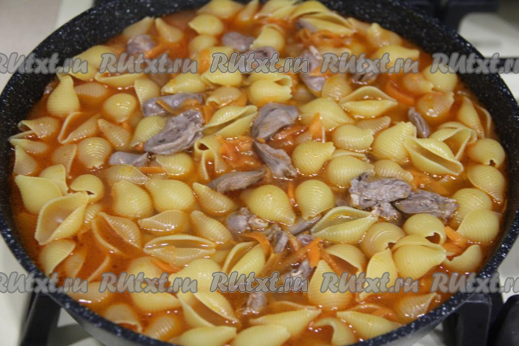 Влить примерно 600 миллилитров кипящей воды, перемешать. Макароны должны почти полностью быть в воде. Как только вода закипит, убавить огонь до минимума и накрыть сковороду крышкой. Томить макароны с сердечками до готовности макарон (примерно 12-15 минут).