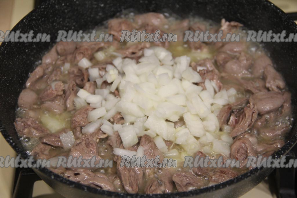 К обжаренным сердечкам добавить мелко нарезанный лук, перемешать, обжаривать 5 минут, не забывая время от времени перемешивать.