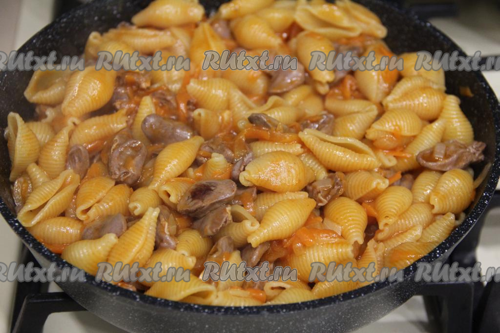 Куриные сердечки вместе с макаронами и соусом, образовавшимся в процессе приготовления, разложить со сковороды по тарелкам и подать очень вкусное, аппетитное и сытное блюдо в горячем виде к столу.