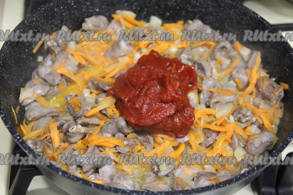 К сердечкам, обжаренным с луком, выложить морковку, натёртую на крупной тёрке, перемешать, обжаривать 5 минут, периодически перемешивая.
