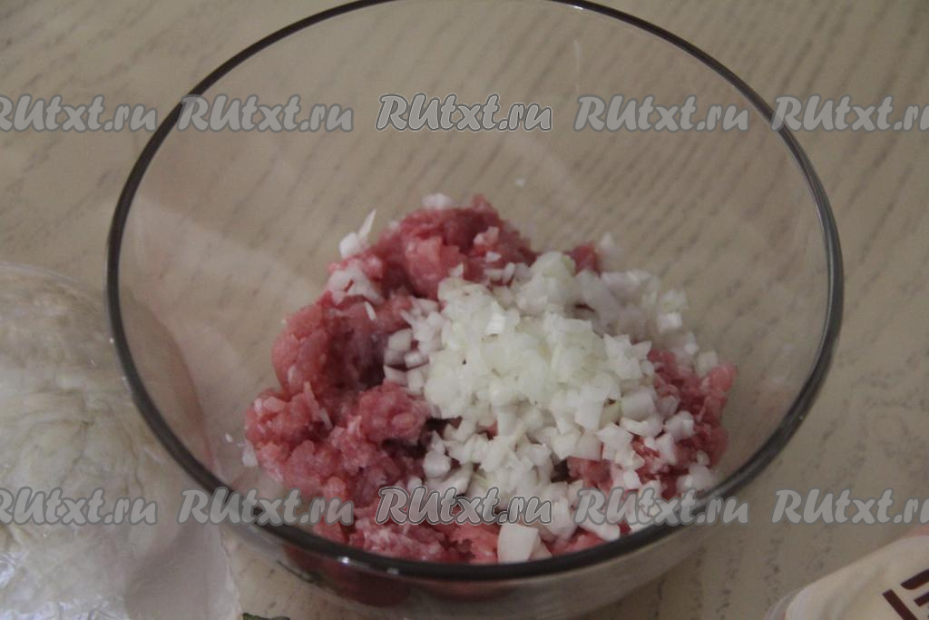 Лук и чеснок мелко нарезать. В миску выложить фарш, добавить нарезанные лук и чеснок.