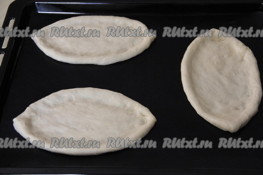 Руками сформировать из теста заготовки в форме лодочек с небольшим бортиком. Я формировала лодочки сразу на противне, застеленном ковриком для выпечки. Вместо коврика можно застелить противень пергаментом.