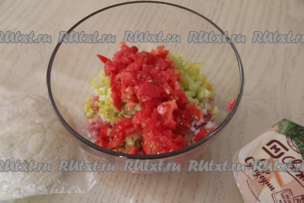 Следом в миску выложить мелко нарезанный помидор.