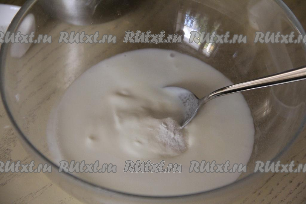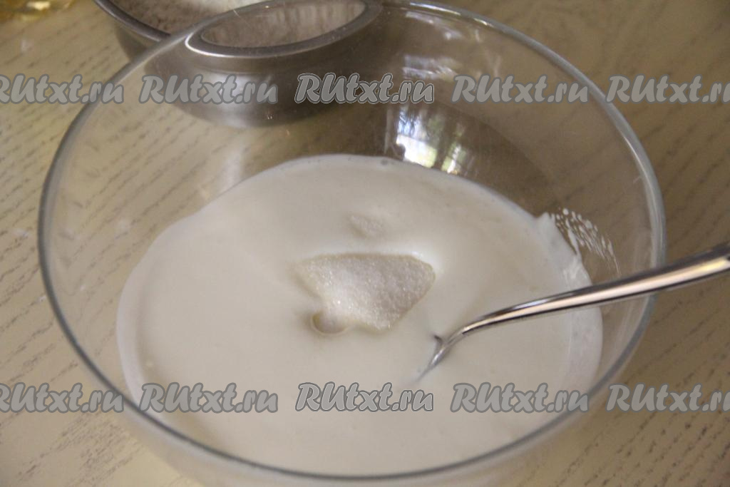 По прошествии 5 минут сода погасится в кислой среде кефира, поэтому поверхность смеси запузырится. В запузырившуюся смесь добавить сахар и соль.