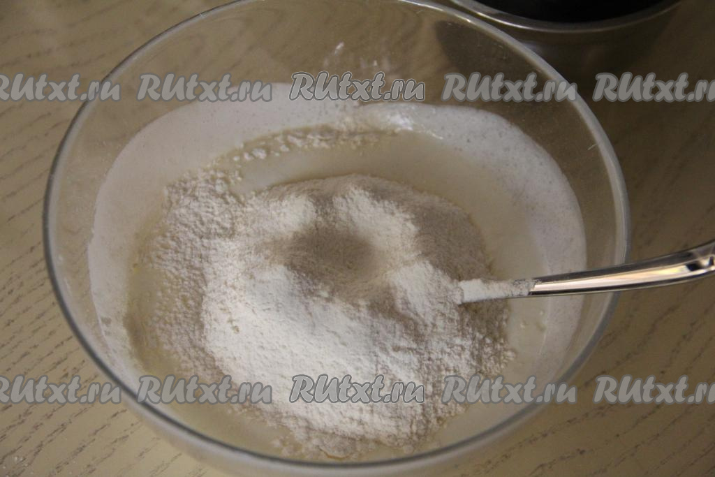 Всыпать половину просеянной муки в получившуюся смесь, перемешать тесто ложкой.