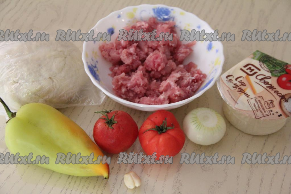 Пока тесто "отдыхает", займёмся начинкой. Фарш можно приготовить в домашних условиях, пропустив через мясорубку кусочки мяса (я сделала фарш из свинины), а можно взять покупной фарш. Из болгарского перца удалить плодоножку вместе с семечками. Промыть водой перец и помидоры. Лук и чеснок почистить.