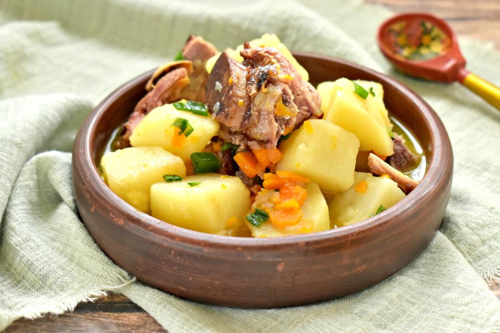 Предлагаю на обед приготовить аппетитное, вкусное, ароматное и сытное жаркое с копчёными рёбрышками и картошкой. Блюдо готовится несложно. Копчёные свиные рёбрышки делают вкус жаркого насыщенным. Сочетание в меру мягкого тушёного картофеля и ароматного мяса - очень удачное, поэтому это блюдо всегда вносит приятное разнообразие в семейное меню!