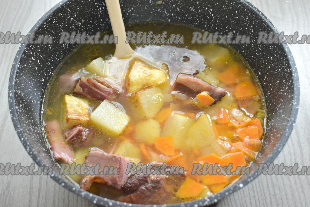 Вливаем в кастрюлю столько воды, чтобы она полностью покрывала овощи и рёбра. Даём воде закипеть на достаточно сильном огне, убавляем огонь до минимума, кастрюлю накрываем крышкой.
