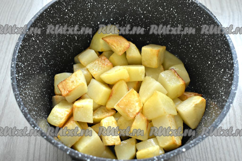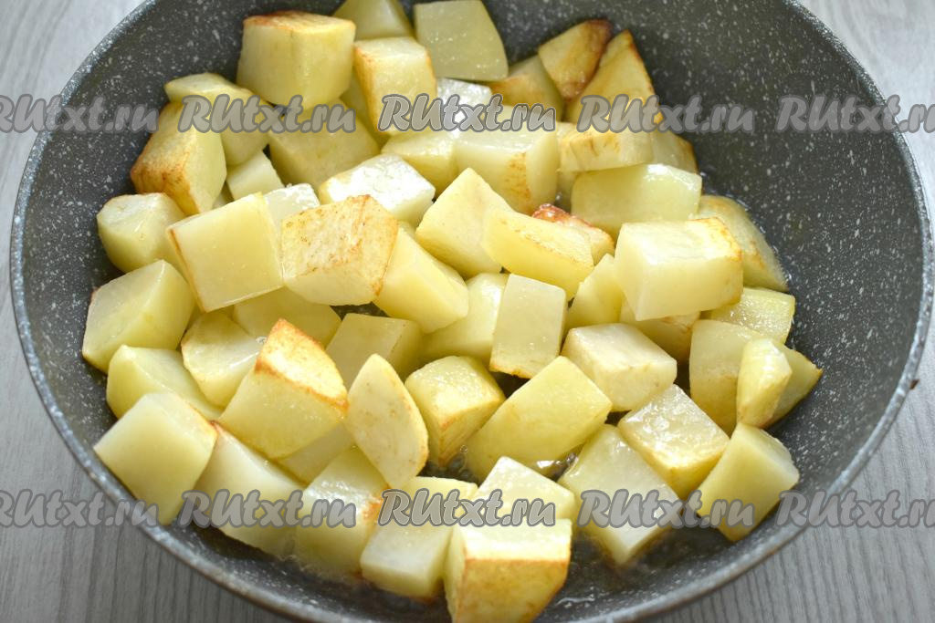 Очищаем картофель, промываем его холодной водой и обсушиваем бумажными полотенцами. Нарезаем картошку на крупные кубики. В сковороде прогреваем растительное масло, выкладываем нарезанный картофель. Огонь делаем достаточно сильным. Обжариваем картошку примерно 10 минут, часто перемешивать не нужно. В процессе обжаривания картофельные кубики сверху покроются лёгкой корочкой, но внутри останутся сырыми.